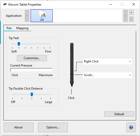 아래와 같이 타블렛 필압을(팁을 부드럽게 혹은 강하게 하는) 정할 수 있고 펜의 스위치 부분 기능도 본인 편의에 맞게 설정하실 수 있습니다. 저는 아직까지 그림을 그리고 클릭을 하는 기능만 사용하고 있습니다.